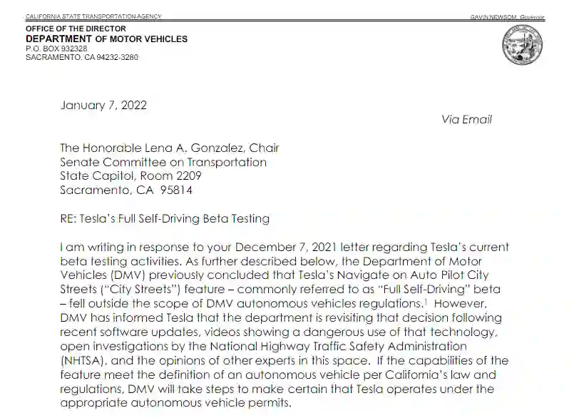 DMV发言人表示,「我们已通知特斯拉,将启动对其车辆技术的进一步审查,如果这些技术和功能符合加州法律法规对自动驾驶汽车的定义,DMV 将采取措施,确保特斯拉在适当的自动驾驶汽车许可下运营。」