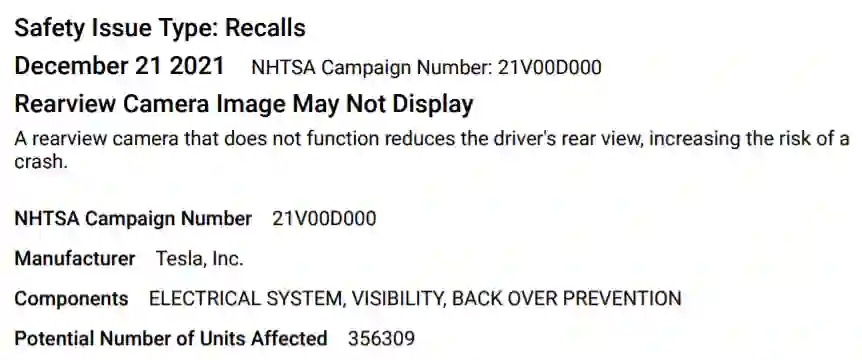 最近一次的大规模召回涉及356309辆Model 3和119009辆Model S ,原因是车辆的后视摄像头和前引擎盖存在潜在的故障风险。