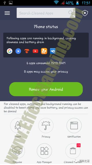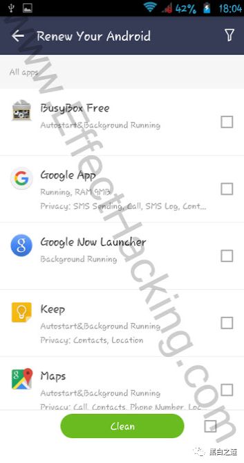 MoboClean是一款Android工具,可以帮助您加速设备和控制应用程序权限。它就像XPrivacy, 但有更多的功能,它适用于非root用户设备。