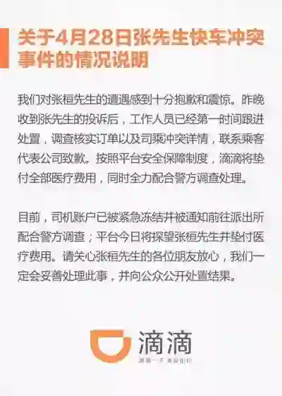 目前,司机账户已被紧急冻结并被通知前往派出所配合警方调查;平台今日将探望张桓先生并垫付医疗费用。请关心张桓先生的各位朋友放心,我们一定会妥善处理此事,并向公众公开处置结果。