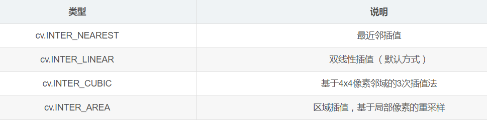 通常,缩小图像使用区域插值(cv.INTER_AREA),放大图像使用三次样条插值(cv.INTER_CUBIC)和双线性插值(cv.INTER_LINEAR)。三次样条插值方式速度较慢,双线性插值方式较快且效果也不错。