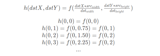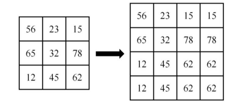 将一幅3*3图像放大到4*4,用f(x , y)表示原图像,h(x ,y)表示目标图像,我们有如下公式: