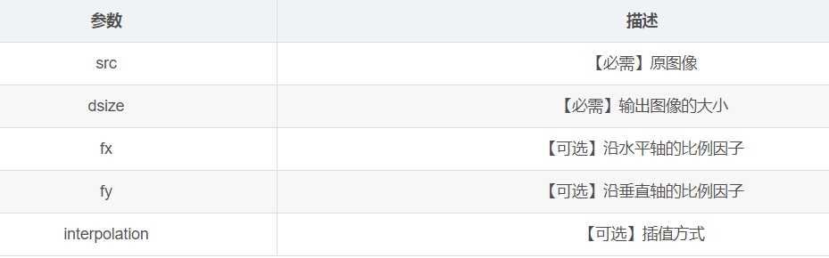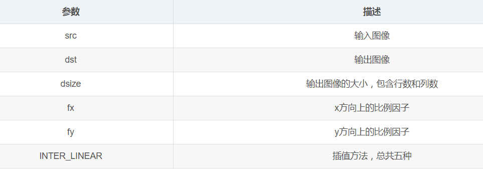 如果dsize的值None,目标图像的大小通过fx和fy确定。fx为列数缩放的倍数,fy为行数缩放的倍数。