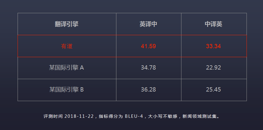 自 2017 年 4 月,有道自主研发的 NMT 系统上线,其采用了以 Seq2Seq 方法为基础的模型。而目前有道已采用了更为先进的,以 Transformer 为基础架构,并研发出第三代高效翻译系统。据称,在英译中和中译英的对比评测中,有神经网络翻译的 BLEU 值超过了其他两款国外翻译引擎。