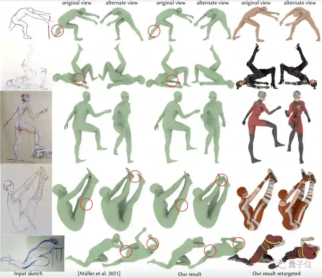 比如上图第一行中的人手(不过我们发现左边的似乎推测有错,手应该是放在两腿之间;右边的抱头基本没啥问题,但手掌应该向后弯曲)。