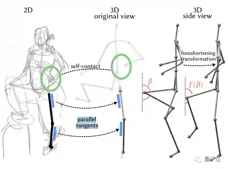 其中,2D骨骼切线(下图蓝色部分)是预测3D骨骼方向最有力的指标(关节位置不行)。