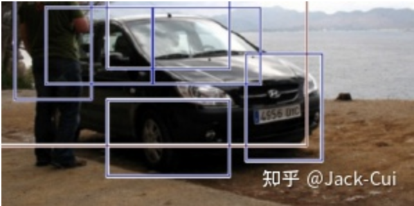 就像上面的图片一样,定位一个车辆,最后算法就找出了一堆的方框,我们需要判别哪些矩形框是没用的。