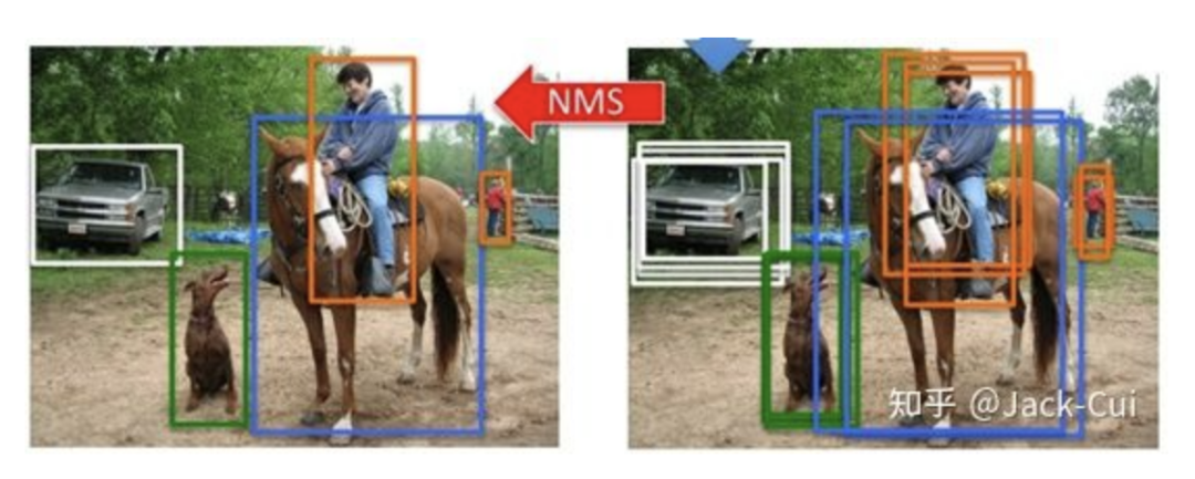 NMS,即非极大值抑制,就是将一些冗余框去掉,示意图如下: