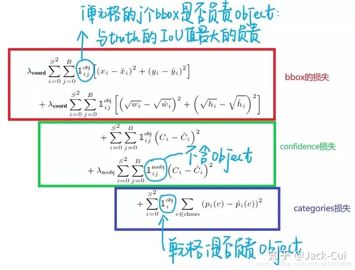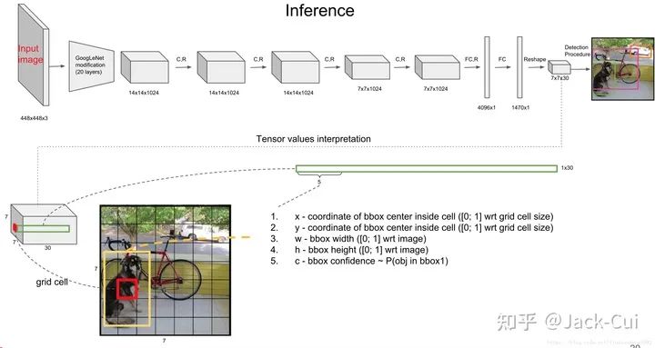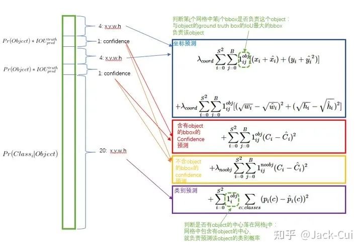 来看一下每个单元格预测的B个(x,y,w,h,confidence)的向量和C的条件概率中,每个参数的含义(假设图片宽为 高为 ,将图片分为 :