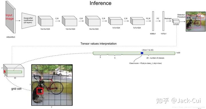 而后面的 20 个,就是类别的概率,YOLO v1 是在 VOC 数据集上训练的,因此一共 20 个类。