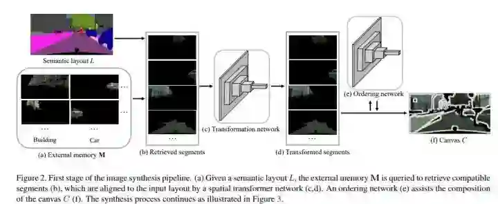 test 的时候,对于一个 semantic label map,我们的模型将其 segment,并从 M 中基于形状等信息找到对应的component。match 的块的填充将要被填充到一个 canvas 上,由一个网络完成;为了预防重叠,设计了另一个网络来设计填充的顺序。