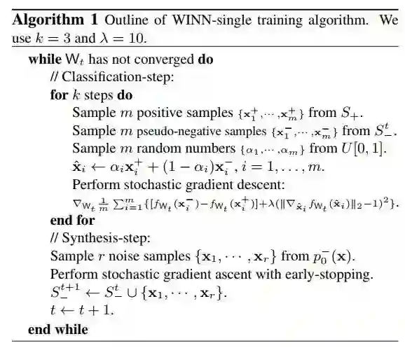 上图为分类过程 loss 的设计,图中两个公式,前者是目标函数,很容易理解,后者则是正则项,正则项是以随机的 a 来生成真数据(x+)与生成的假数据(x-)的 mixture。