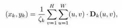 在如图公式中,Dk(u,v) 意思是第 k channel 中坐标为 (u,v) 的值,Dk 是 weight map,与对应坐标相乘,再除以总的权重和坐标乘积的和,从而生成该 channel 的 landmark 的 normalized 坐标。
