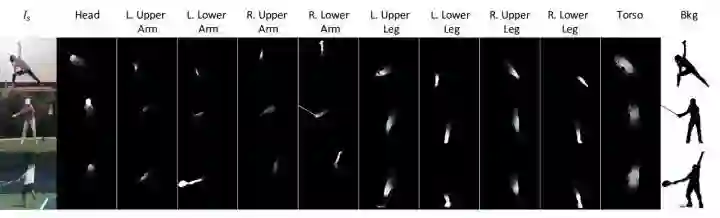 网络的输入是 original img,original pose,target pose,并预设 original img 和 target img 背景一样,人是同一个。 首先前后景分离,然后针对前景(即人),针对身体的不同部分做细致的 segment。