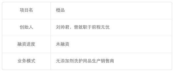“橙品”是一款主打无添加剂的洗护用品品牌。该品牌共有洗洁精、果蔬净、洗衣液、内衣液四款产品。“橙品”中不含香精、荧光增白剂、防腐剂、色素等成分,创始人刘帅君从巴西采购纯度97%的橙油(由橙皮冷榨获得)作为原料,使产品散发出天然橙皮香气。