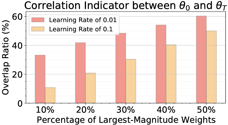 当学习率较低时,训练「中奖网络」和随机重新初始化网络的准确率不同,作者试图从这点出发,从而揭示出中奖属性的原因和条件。作者通过研究权重的相关性来实现这一目标。