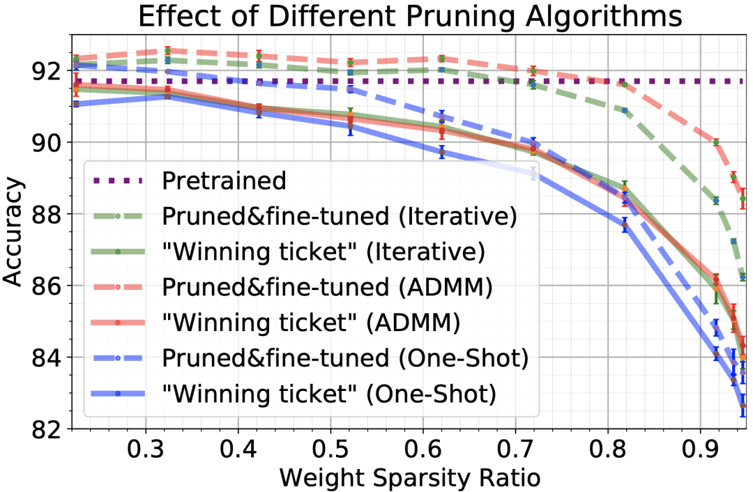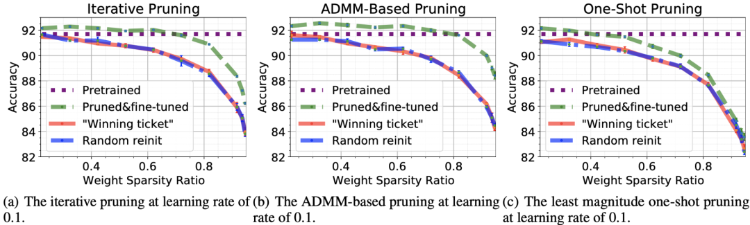 图7 在三种剪枝算法(迭代剪枝、基于ADMM的剪枝和一次性剪枝)进行掩码生成下,「剪枝与微调」以及稀疏训练(「中奖网络」方案)的准确率表现。