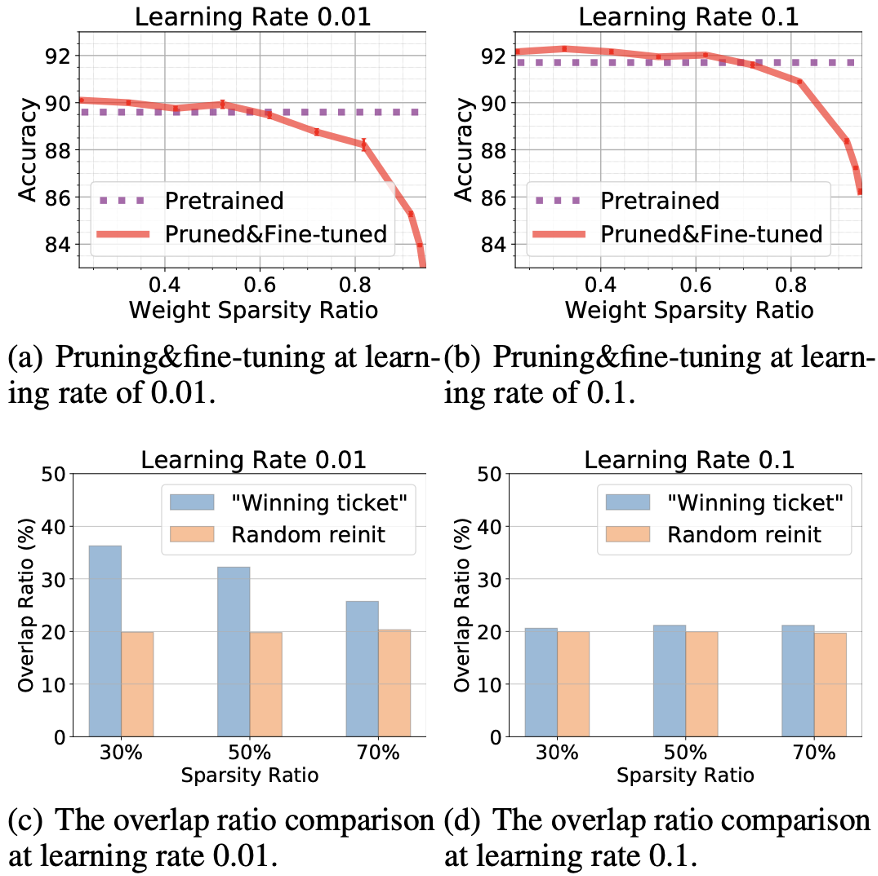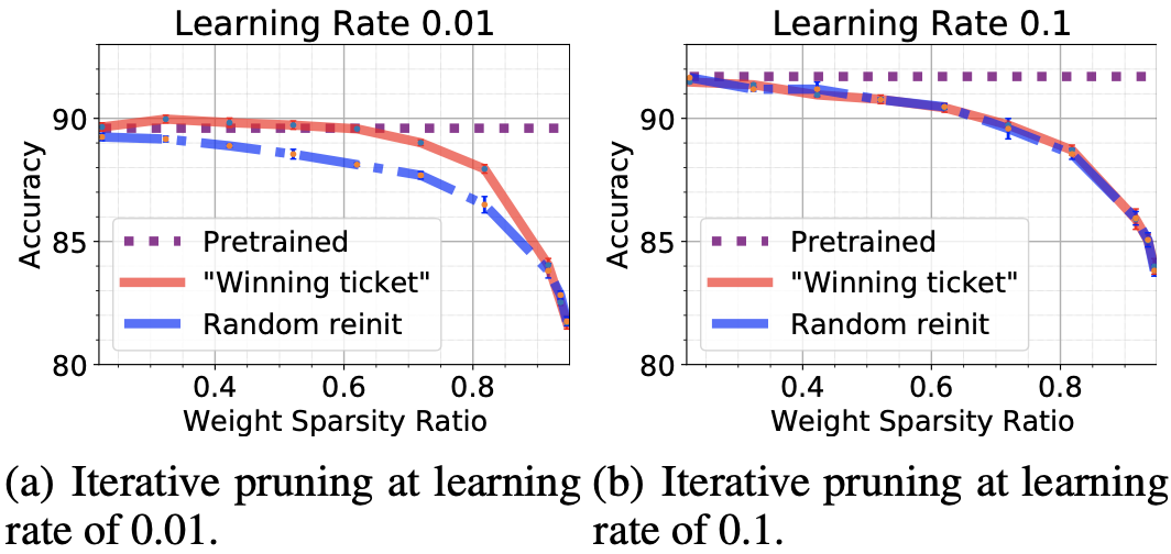 在彩票假说工作中发现,在低学习率的情况下可以通过迭代剪枝算法(Iterative pruning)观察到中奖特性,但在较高的初始学习率下,特别是在较深的神经网络中,很难观察到。