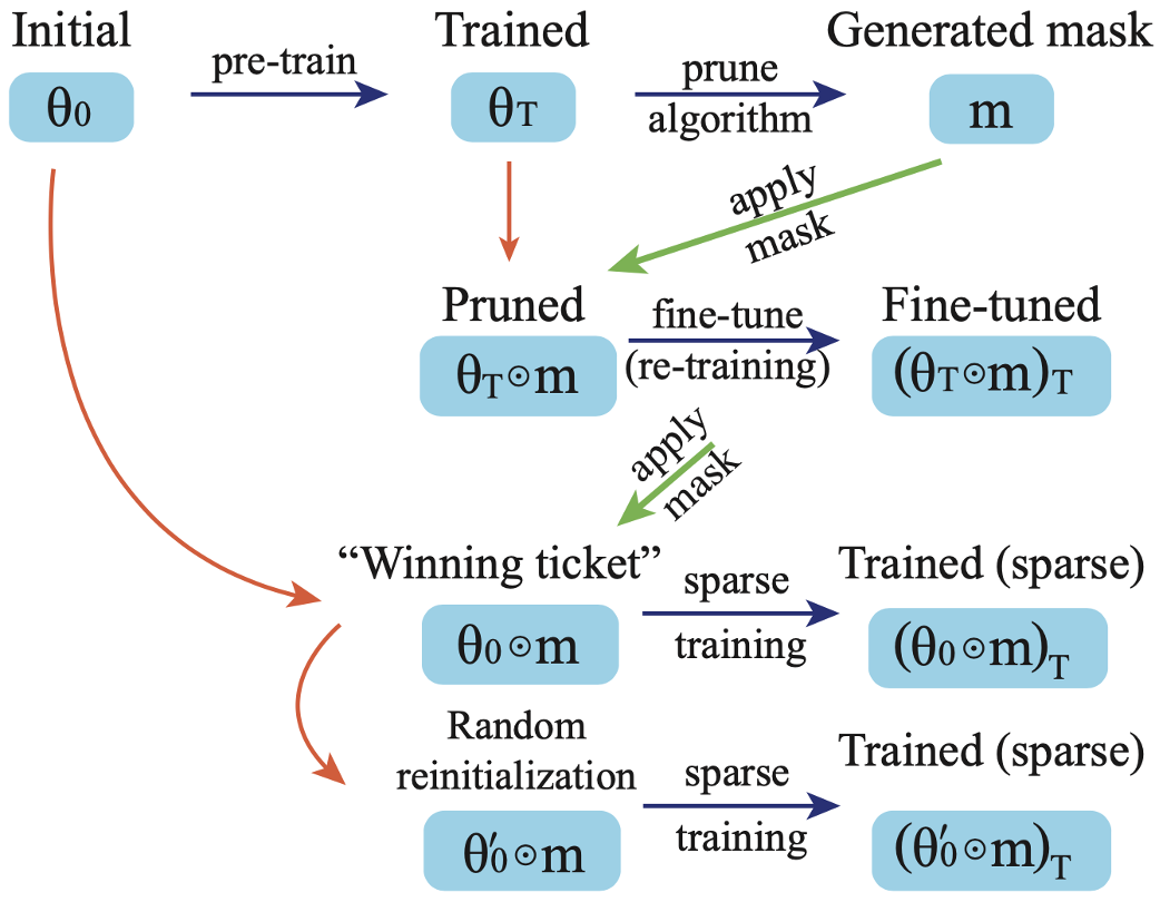 在深度模型压缩领域中,「彩票假说」(Lottery Tickets Hypothesis)指出一个原始神经网络可能存在中奖彩票的子网络(Winning ticket),该子网络可以达到和原始网络相近的准确率。