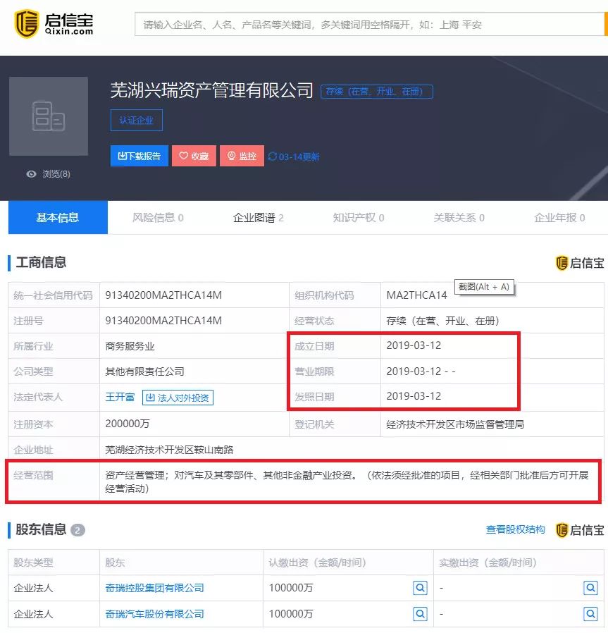 36氪讯,启信宝数据显示,奇瑞汽车股份有限公司3月12日新增对外投资,成立芜湖兴瑞资产管理有限公司,法定代表人为王开富,注册资本达2亿人民币,经营范围为资产经营管理、汽车及其零部件、其他非金融产业投资。这距奇瑞控股上次对外投资已经过去三年。