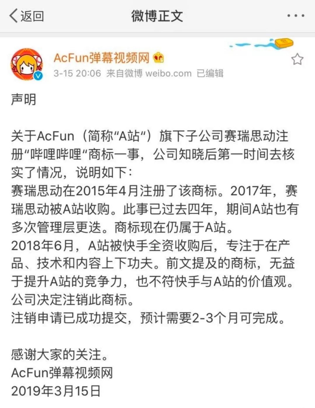 36氪讯,上周,A站被爆抢注了“哔哩哔哩”商标一事导致网友热议,A站官方微博昨日宣布已成功提交注销“哔哩哔哩”商标的申请。声明表示,赛瑞思动在2015年4月注册了该商标。2017年,赛瑞思动被A站收购。此事已过去四年,前文提及的商标,无益于提升A站的竞争力,也不符快手与A站的价值观。公司决定注销此商标,注销申请已成功提交,预计需要2-3个月可完成。