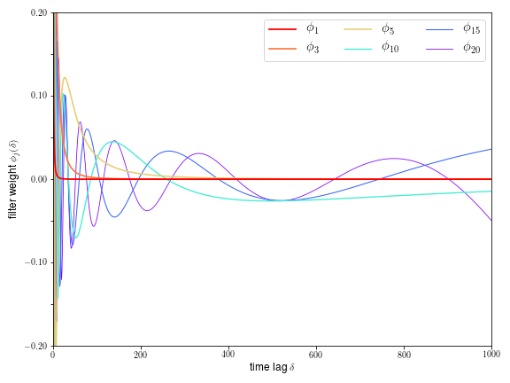 滤波器幅值与时间关系图中描绘的一组滤波器。借助频谱滤波技术,我们可以使用多个滤波器预测给定时间的线性动态系统状态。每个滤波器都是一组权重,用于总结过去的观察值,这样就可以以加权方式将它们组合起来,随着时间的推移,我们可以更准确地预测系统