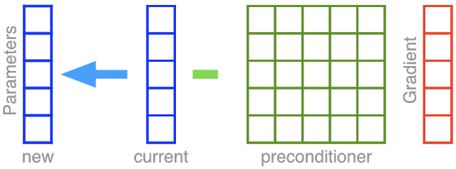 此方法旨在改变优化目标景观的几何结构,从而使梯度下降法更容易发挥作用。为此,我们采用预处理方法拉伸和旋转空间。经过预处理的地形看起来仿佛右上方图片中平静的湖面,是一个近乎完美的球形,而下降轨迹则是一条直线!从程序上来看,相比于从参数向量本身去除梯度向量,自适应预处理首先通过一个名为矩阵预处理器的 5×5 多单元格结构增加梯度,如下图所示。