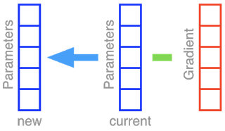 梯度下降 (GD) 及其随机版本随机梯度下降 (SGD) 是用于优化神经网络权重的选择法。通过将全部参数堆叠在一起,形成一组组合成向量的单元格。我们简单观察一下,然后假设我们的神经网络只有 5 个不同的参数。采取梯度下降步骤意味着从当前参数组(蓝色)中去除梯度向量(红色),并将结果放回到参数向量中。