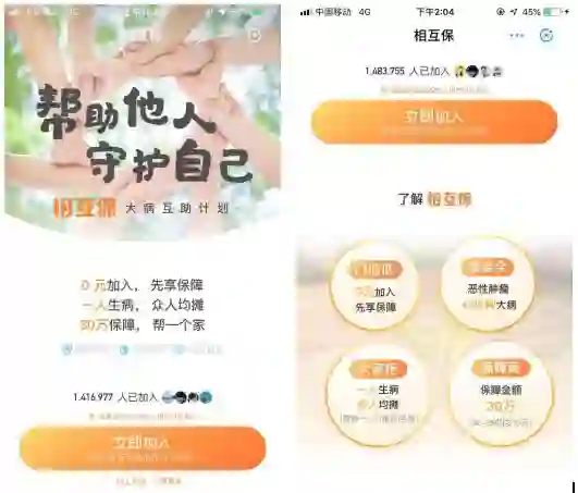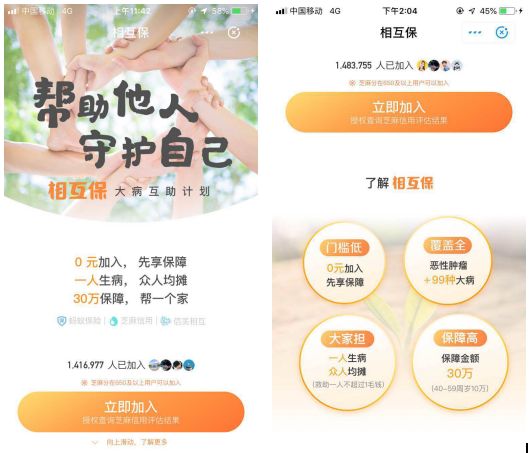 昨天支付宝内蚂蚁保险板块上线了一个新鲜事物——相互保。带着好奇点进去,感觉支付宝真的又在搞事情:0费用加入相互保,自己生病的时候就能拿到最高30万,如果其他成员得病,全体人员均摊赔付款,单次支付不超过1毛钱。