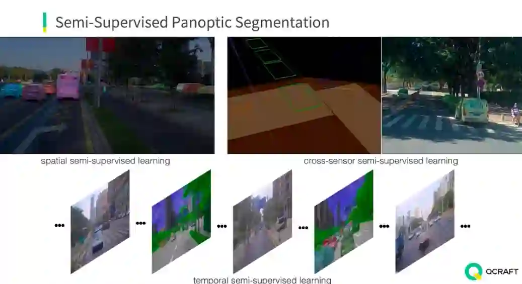 具体来说,可以从三个方面入手解决。第一个方面是空间维度的半监督学习,即在一帧图像中,只标注部分实例,其它的部分通过算法来挖掘。另一个方面是时间维度的半监督学习,利用视频数据的连续性,相邻帧之间变化的区域比较小,只标注关键帧,借助伪标签等半监督学习技术可以节省大量的标注工作量。第三个方面是从多传感器融合的角度出发,比如将点云中标注的点投影到图像,可以生成图像中的标注。这三种方式可以结合起来,最终提高全景分割模型的性能。