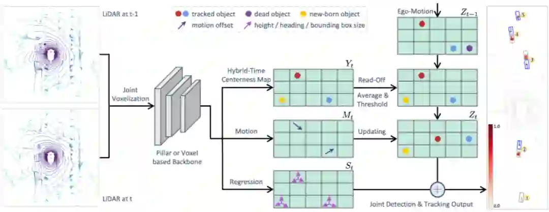 上述模型结构用于训练阶段,在推理和测试阶段,还将结合上一时刻的 centerness map 进行优化。推理的算法流程如上图所示,对于 t=0 时刻,网络只执行检测任务,用于初始化跟踪轨迹。对于 t>0 时刻,先将上一时刻的 centerness map 通过自车位姿估计转换到当前时刻,转换后的 centerness map 和当前时刻的 centerness map 相加求平均,得到当前时刻的检测结果,该检测结果通过上一时刻对应的格网位置直接得到目标的跟踪索引,同时通过阈值判断剔除失效的跟踪目标,对新的检测目标,初始化新的跟踪轨迹。最后,使用运动估计分支预测的目标偏移,更新当前帧目标的位置。