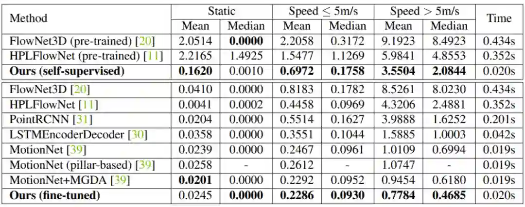 所提出的模型在自动驾驶公开数据集 nuScenes 上进行了评估,下表显示的是和当前先进的算法的比较。可以看到提出的自监督模型取得了比 FlowNet3D 和 HPLFlowNet 更好的性能,而且这两个模型在 FlyingThings3D 和 KITTI SceneFlow 数据集上进行了有监督的预训练。通过在训练集上微调,提出的模型达到了当前最好的性能。