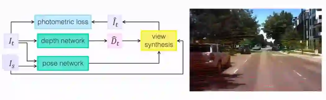 下图左侧所示是一种经典的自监督单目深度估计模型。其输入包括前后两帧图像,即目标图像,和取自目标图像相邻帧的源图像。该模型包含两个网络,其中 depth 网络从目标图像估计每个像素的深度,pose 网络的输入为目标和源图像,输出两个图像之间的 6 自由度(6-DoF)位姿变换。源图像根据估计的位姿以及深度信息可以合成一个新的目标图像,通过计算目标图像与合成图像之间的光度误差(photometric loss)可以得到自监督学习的损失函数。