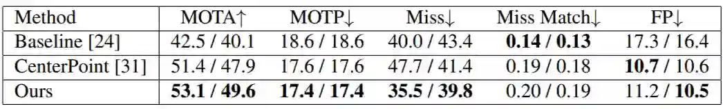 研究团队在 Waymo 和 nuScenes 数据集上进行了实验。Waymo 验证集上的实验结果如上表所示。评估方法采用多目标跟踪通用的评估指标。其中 Baseline 是 Waymo 官方提供的传统的基于卡尔曼滤波的方法,从实验结果可以看到,提出的模型相比 Baseline 和 CenterPoint 在各个指标上均有较大提高。更重要的是,SimTrack 不需要手动设计匹配规则或者调试相关的参数,从而极大简化了模型的开发和提升了模型泛化性能。
