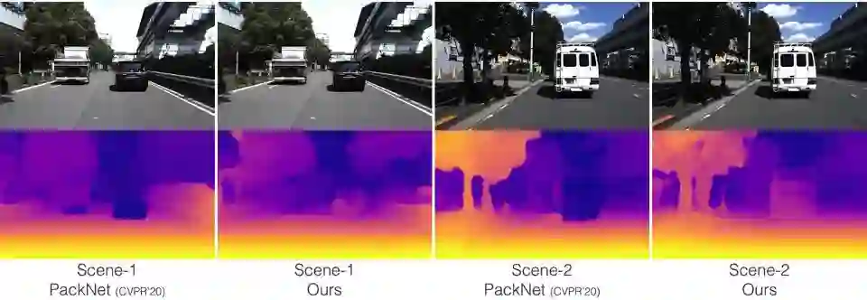 上图所示为单目深度估计的实验对比,其中 PackNet 是 CVPR'20 提出的深度估计模型,可以看到研究团队设计的模型相比该模型有明显性能提高,尤其是对运动目标的深度估计。PackNet 对上图中运动的黑车和白车深度估计不准确,将其估计为无穷远点,而轻舟智航研究团队提出的方法很好地克服了这一问题。