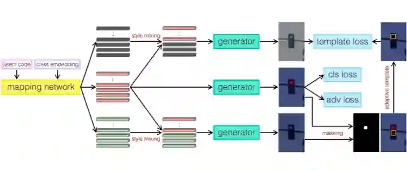 一个直接的方法是采用生成模型例如 StyleGAN 来生成合成数据,但是这种无条件(unconditional)的生成模型无法控制所生成图像的类别。通过条件式(conditional)生成模型,如下图所示,在输入端除了输入 latent code,还将类别信息通过类嵌入(class embedding)的方式输入网络。在损失函数上,加入类别预测的损失函数,这样就可以把无条件的生成模型转换成基于类别嵌入的条件式生成模型,实现类别可控的图像生成。