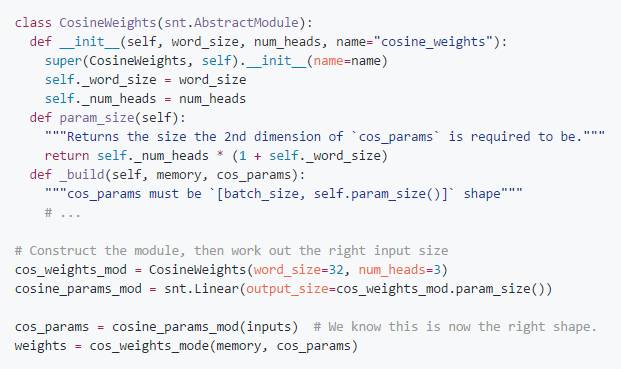 如果上面的操作是作为op cosine_weights(memory, cos_params, word_size, num_heads) 实现的,那么指示cos_params所需大小的逻辑必须存储在一个单独的函数中。将相关功能封装到一个模块中会让代码更清晰。