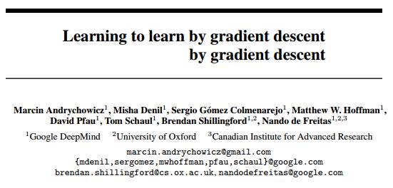 这篇文章的题目非常有意思,叫做《通过梯度下降学习通过梯度下降学习》,将优化算法作为学习问题,让算法学会自动探索需要的结构。作者包括牛津大学教授、DeepMind 研究员 Nando de Feritas。
