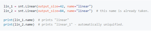 除了可变共享之外,在我们希望将配置参数附加到操作系统的情况下,使用Sonnet模块可以很方便。一个例子是[content addressing](可微分神经计算机中的模块),这些模块接收多个配置参数(内存中的每个单词的大小,读写头的数量),这些输入的一些功能定义了有效输入。我们在这个模块之前使用正确输出大小的snt.Linear来提供正确的维度。由于是一个模块,实现起来很容易——在构建时提供configuration,然后提供一个method.param_size(),它给出所需输入的维数。然后我们就能得到正确的输入张量大小并进行连接。