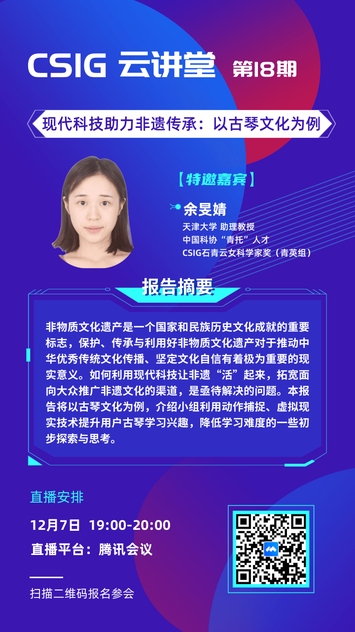 【CSIG云讲堂】12月7日19点,余旻婧主讲:现代科技助力非遗传承:以古琴文化为例