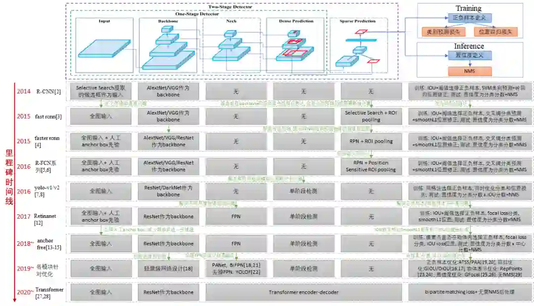 5) 依赖NMS等后处理输出最终的检测结果。后续的物体检测算法基本都是对该框架的各个模块进行改进和优化,我们借鉴yolov4的框架图来对目前主流的物体检测算法进行了归纳和串联,如下图2.2所示。这里不再对每种改进的细节进行赘述,大家感兴趣可以找原文或者文章解读进行细致的了解。