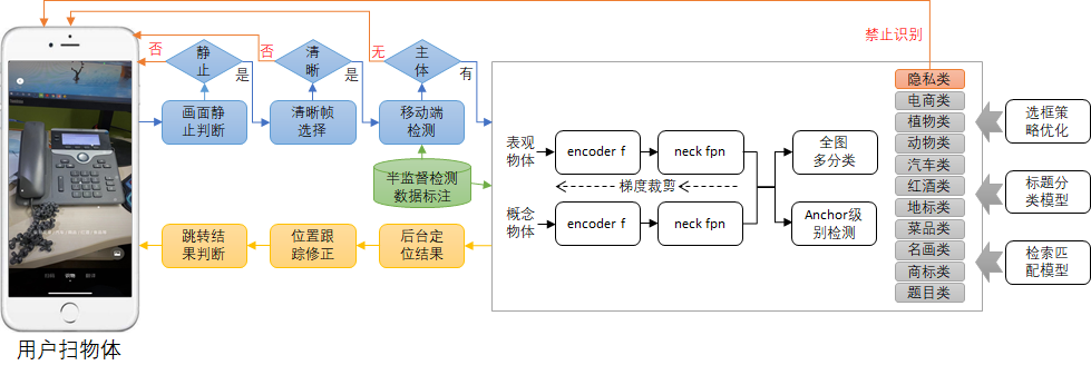 (5)隐私、传输流量和并发问题:对于用户隐私图片如账单等图片自动判别不进行后续识图操作,对用户高清图快速定位显著区域并抠图,减少流量处理,以及部署模型的精度和速度折中问题。