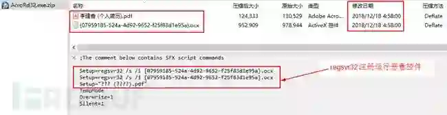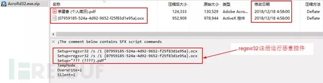 该RAR自解压程序上传时的文件名为“李建香 (个人简历).exe”,最后修改时间同恶意文档1较为接近,图标伪装成AdobeReader。运行后通过“regsvr32”命令注册运行恶意控件,然后打开提示加密的中文PDF文档,由于当前未获取密码,未能知悉正文内容,但目前看来该PDF文档是无恶意行为的。