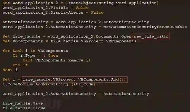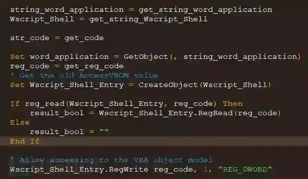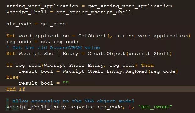 2.获取并解密第二段脚本,试图写入注册表(”HKEY_CURRENT_USER\Software\Microsoft\Office\14.0\Word\Security\AccessVBOM”)。此注册表值为1时,允许对文档的vb模块进行访问和修改,如下图所示: