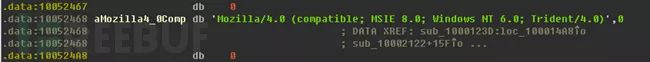 初始化完成后,后门开始通过HTTP协议POST方式,依次与C2列表中可用的C2通讯。HTTP通讯的User Agent为:’Mozilla/4.0 (compatible; MSIE 8.0; Windows NT 6.0; Trident/4.0)’。