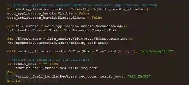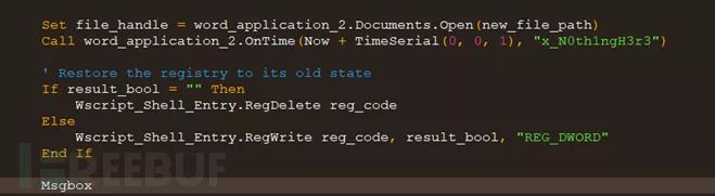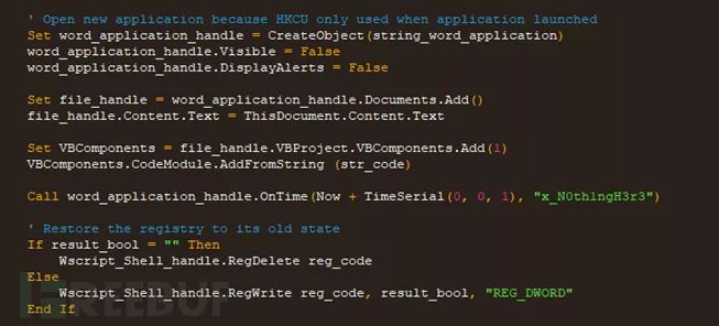 第二段脚本与第一段脚本有颇多相似之处,解密第三段脚本,然后其通过设置注册表,获得对自身vb资源修改的能力,并在文档自身中加入第三段脚本: