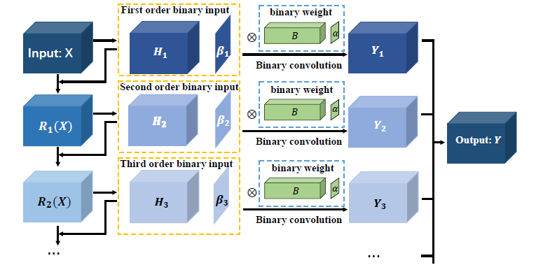 这篇文章提出的HORQ(High Order Residual Quantization)方法,提出了一种针对输入的高阶残差二值量化的方法,既能够利用二值化计算来加快网络的计算,又能够保证训练所得的二值化网络模型拥有较高的准确率。