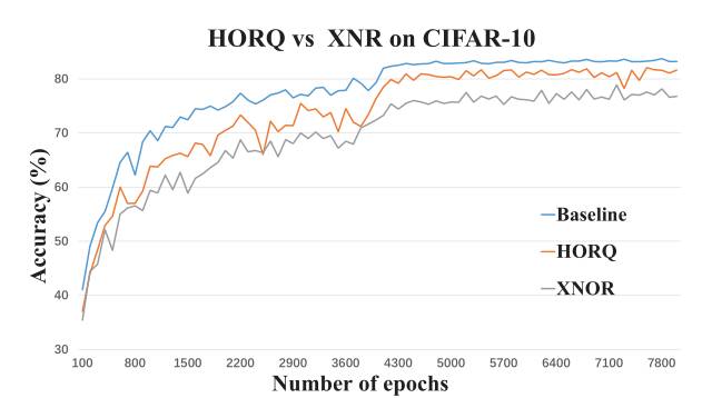 这篇文章的实验部分在MNIST和CIFAR-10数据集上进行测试,发现HORQ-net对比之前对输入简单采取一阶阈值二值化的方法有喜人的优势: