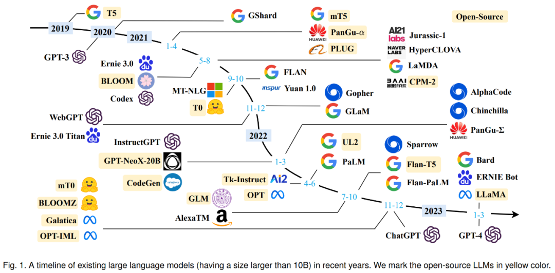 在进入正文前,我们先来看 2019 年以来出现的各种大语言模型(百亿参数以上)时间轴,其中标黄的大模型已开源。
