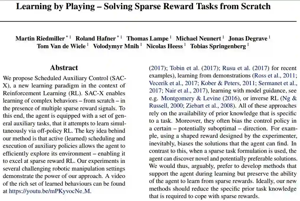 在本文中,我们提出调度辅助控制(Scheduled Auxiliary Control,SACX),这是强化学习(RL)上下文中一种新型的学习范式。SAC-X能够在存在多个稀疏奖励信号的情况下,从头开始(from scratch)学习复杂行为。为此,智能体配备了一套通用的辅助任务,它试图通过off-policy强化学习同时从中进行学习。实际上,我们方法所蕴涵的关键思想在于,主动(学习)调度和辅助策略的执行,使得智能体能够有效地对其环境进行探索,使其能够在稀疏奖励强化学习中表现突出。我们在若干个具有挑战性的机器人操作环境下进行实验,实验结果证明了我们的方法是非常有效的。